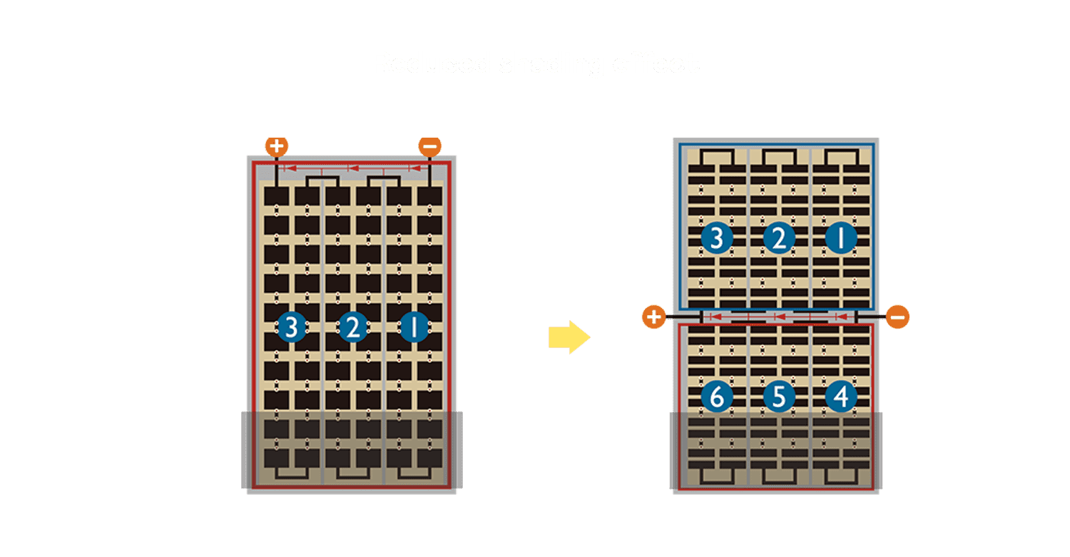 - 电池使用多条铜导线 (Copper wire) 于电池片上形成较短的电流路径,,,,提高电流收集效率,,,采用圆形设计的铜导线较传统扁平式的铜焊带 (Ribbon),,,,可增加入射至电池的光线量。。。。